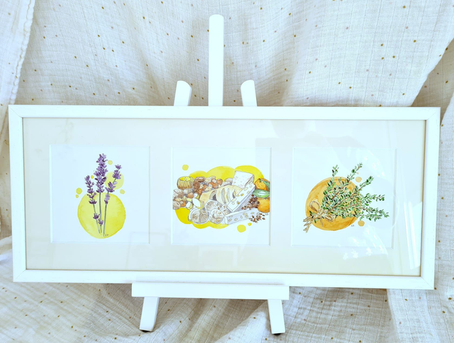 Œuvres originales encadrées : "Lavande", "13 desserts" et "Thym"