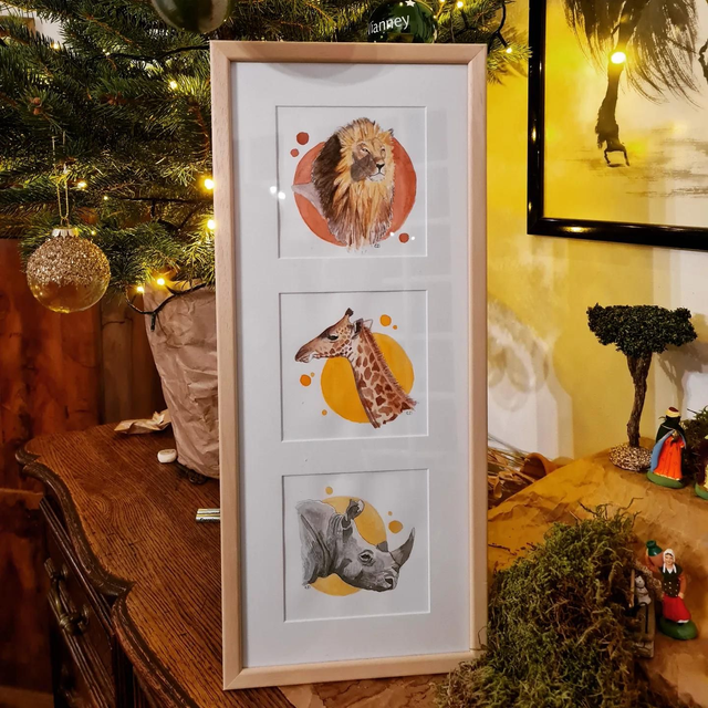 Œuvres originales encadrées : "Lion", "Girafe" et "Rhinocéros"